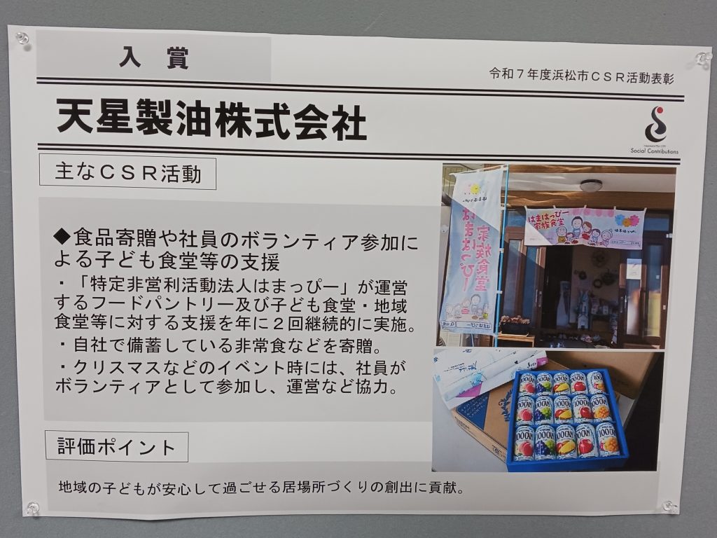 はまこら(浜松市市民協働センター)2階ギャラリーで行われた令和7年度浜松市CSR活動の表彰式に出席し、浜松市長から表彰状を授与されました。